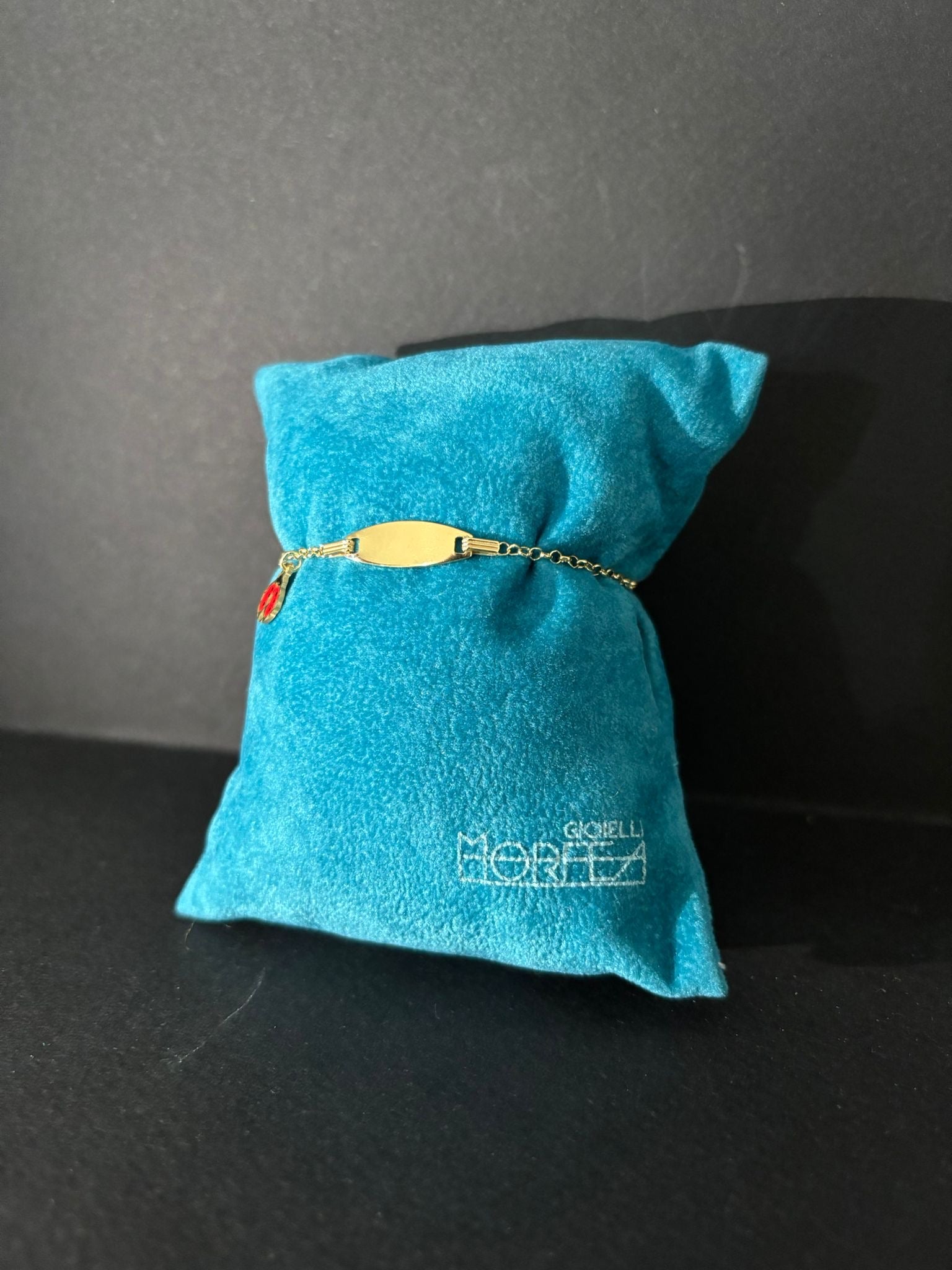Bracciale morfea in argento 925, ciondolo con coccinella e placca, il tutto placcato in oro.
