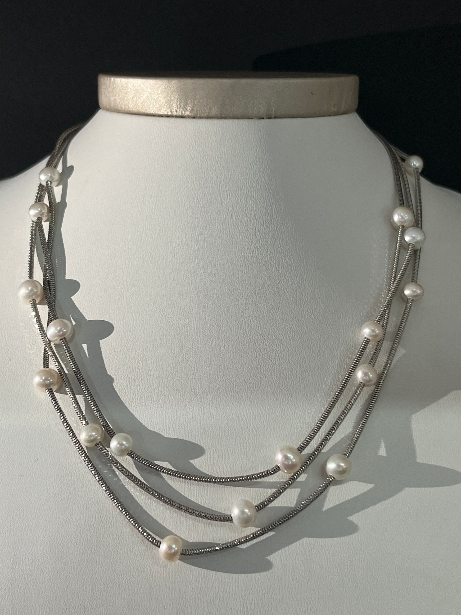 Design: collana multifilo (3 fili) con circa 17 perle di diametri variabili tra circa 5,5 mm e 7 mm
